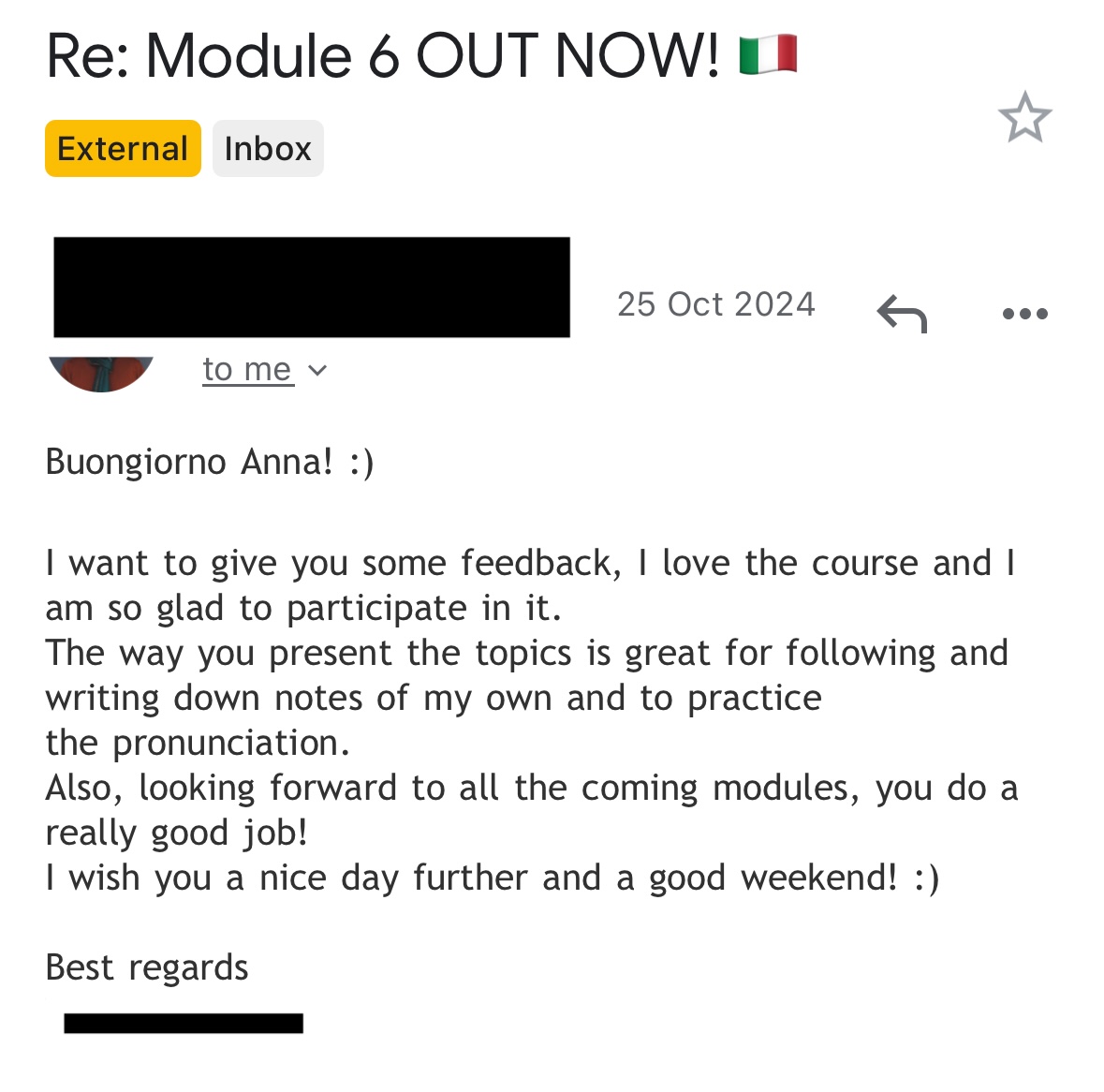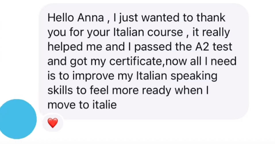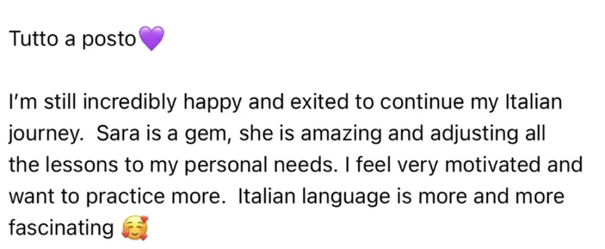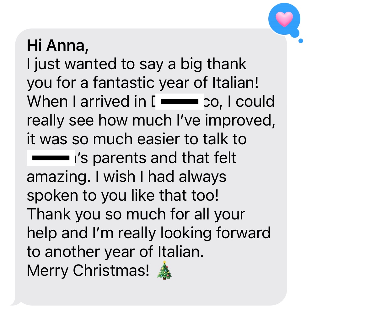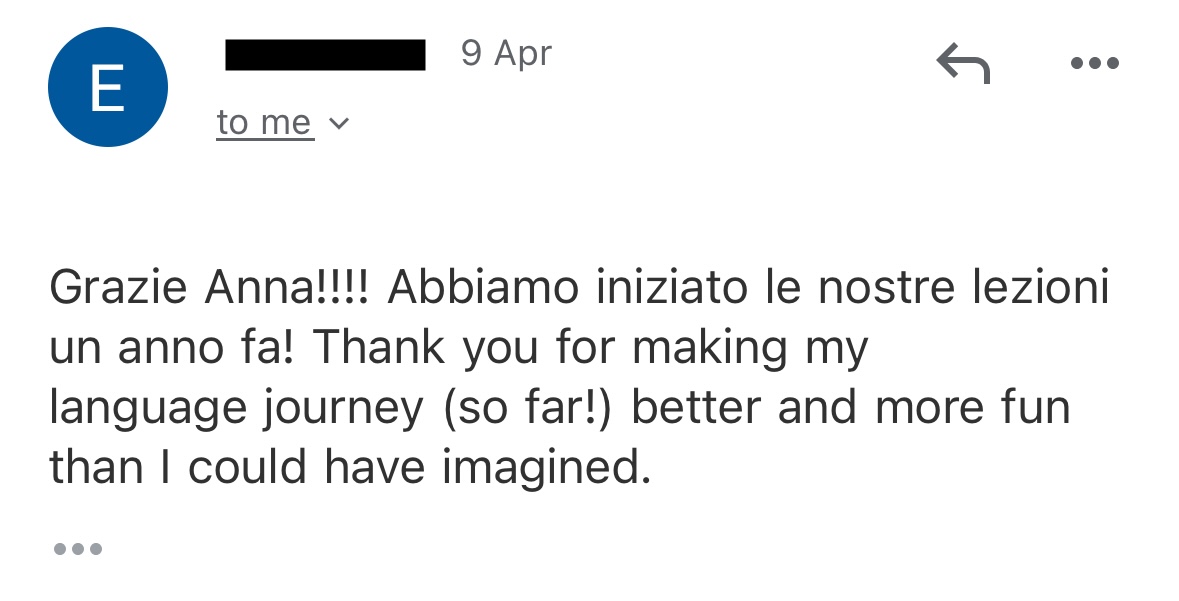 "I started as a complete beginner, I grew into a much more confident Italian speaker thanks to Anna’s guidance, structure, and encouragement.” - Emma