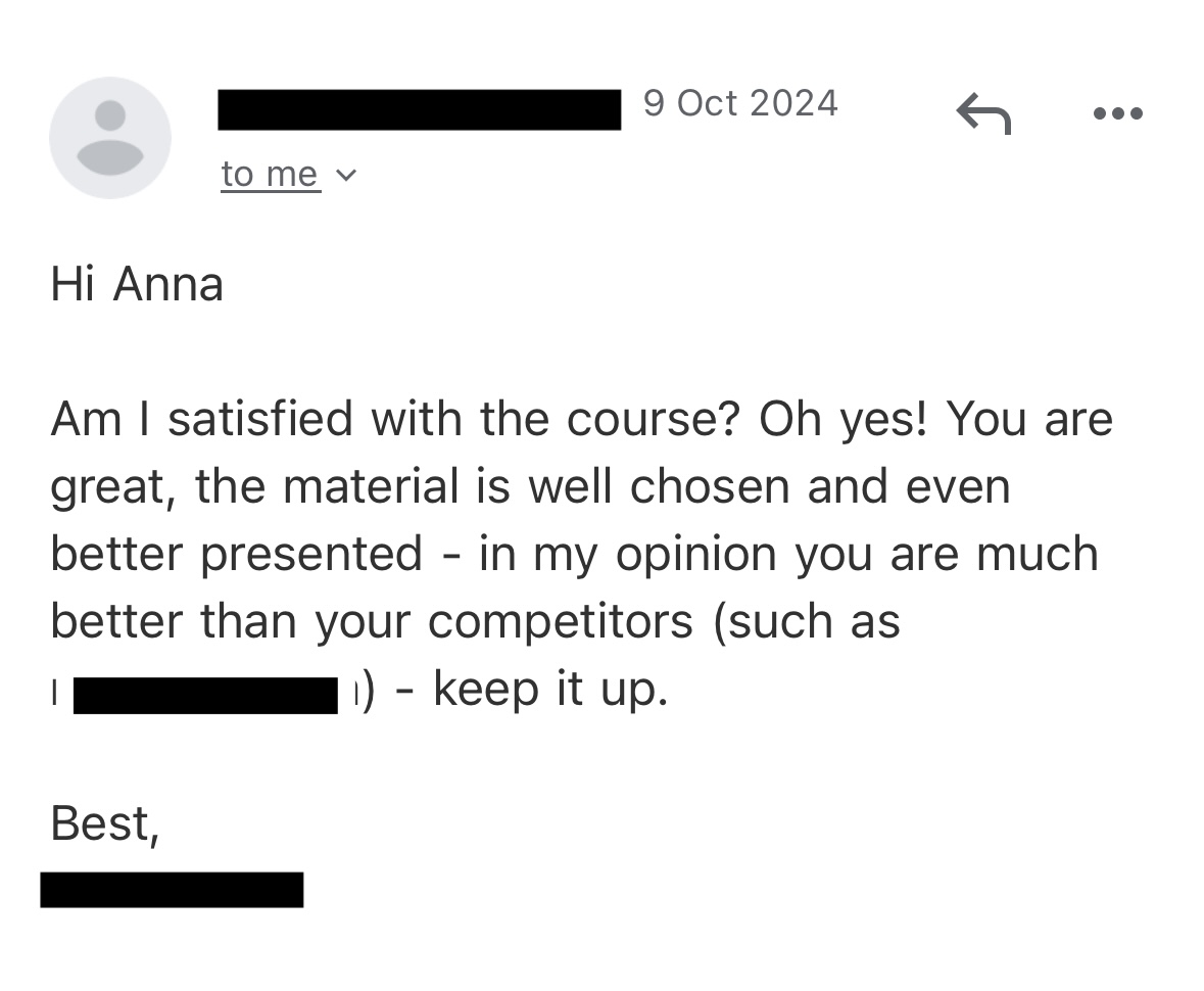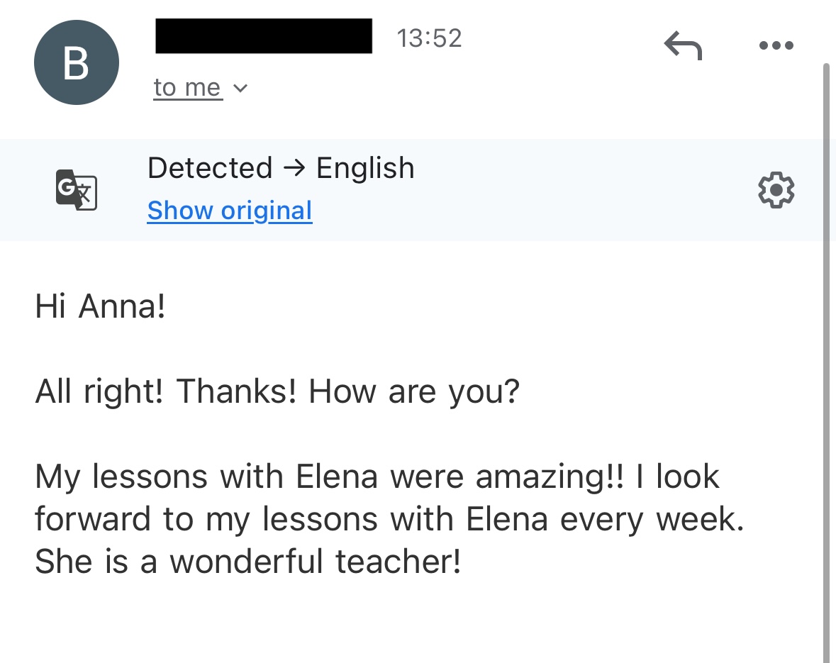 "After 9 months of lessons with Anna, I can now follow conversations and converse with my boyfriend and his family!" - Christina