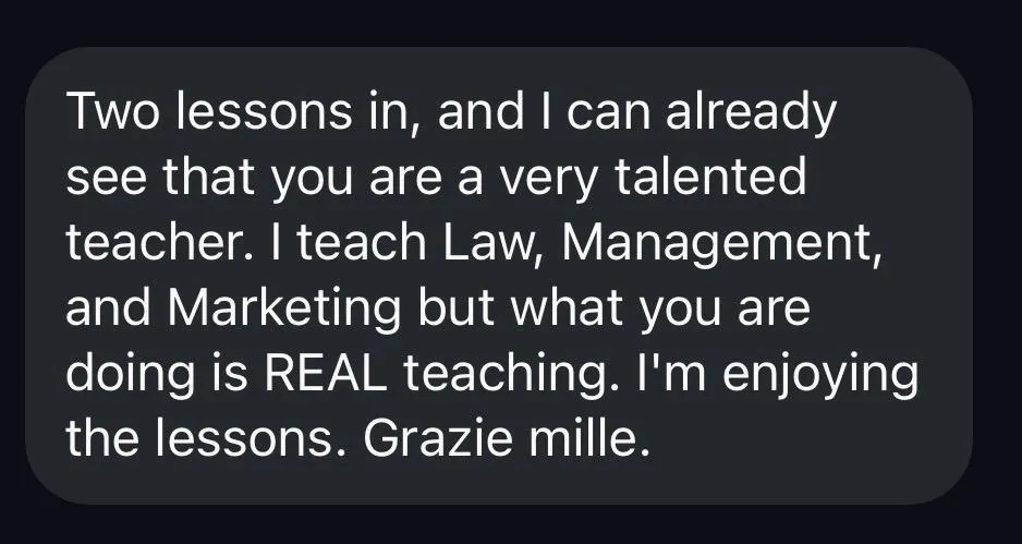 That’s a myth. I’ve helped thousands of Italian learners. From students to professionals, parents and creatives… people who’ve never succeeded with languages before. My method works because it’s human, immersive, and paced for real life.